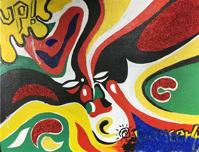 《話臉譜》是由我國傳統(tǒng)戲劇臉譜為基礎(chǔ),經(jīng)過線條、色塊的變形,表現(xiàn)出更為夸張的臉部表情。整體色彩鮮明,對比強(qiáng)烈,亮晶晶的粉末裝飾成為點(diǎn)睛之筆,使傳統(tǒng)的京劇臉譜變得更加鮮活、閃亮。