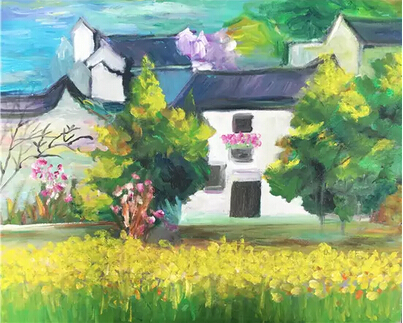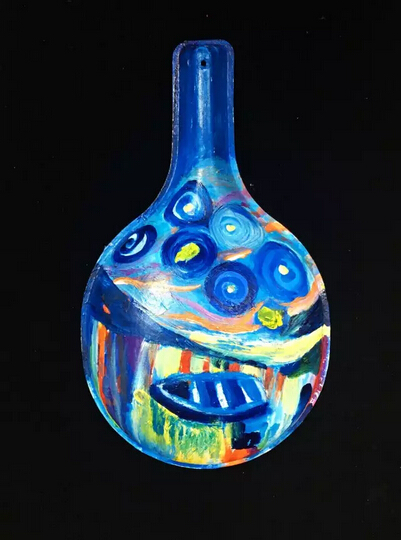 馬勺丙烯畫。在馬勺上,用丙烯顏料畫出房子前的大海,以及周邊的花叢。