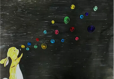 彩色的泡泡都是我用衍紙紙條一個一個卷成的,再把它們一個一個粘到紙上。我最喜歡吹泡泡了,彩色的泡泡帶著我的夢飄呀、飄呀,飄向遠(yuǎn)方……