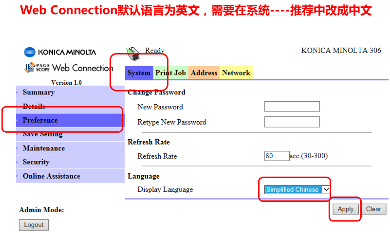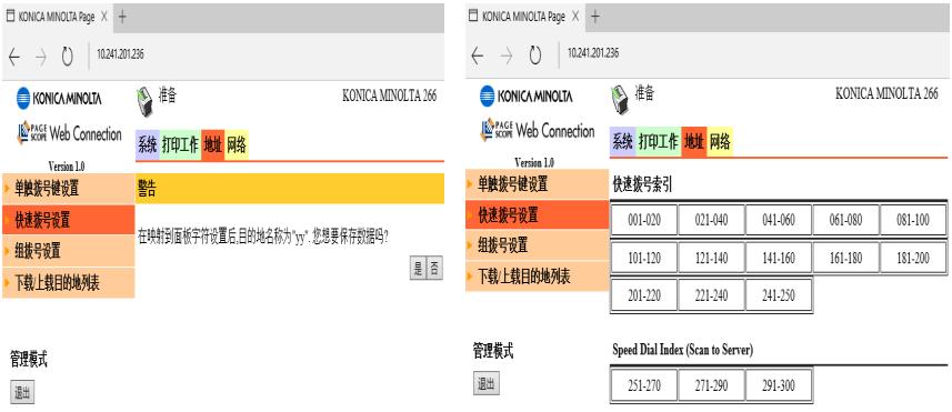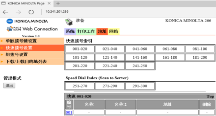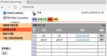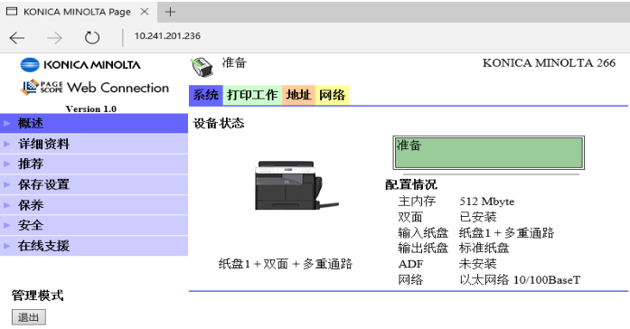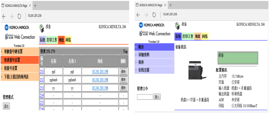 1)PC中打開IE輸入MFP的IP地址,通過PSWC進入管理員模式(管理員密碼:sysadm)