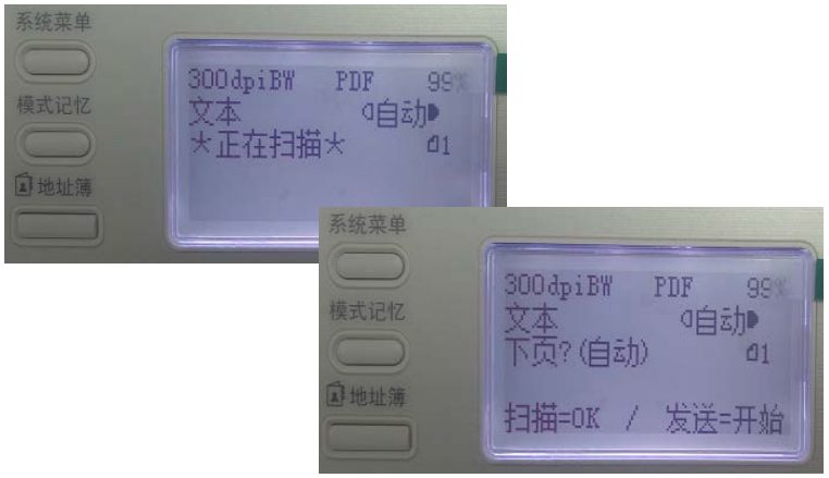 7)如果需要繼續掃描下一頁,則按“OK”,繼續掃描下一頁;如不需要繼續掃描,則按“開始鍵”進行發送